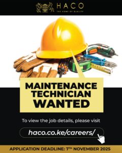 Interested applicants to fill the pre-application forms below and forward copies of their application letters, academic and professional certificates, testimonials, up-to-date curriculum vitae to jobs@haco.co.ke to be received not later than November 7, 2025.
